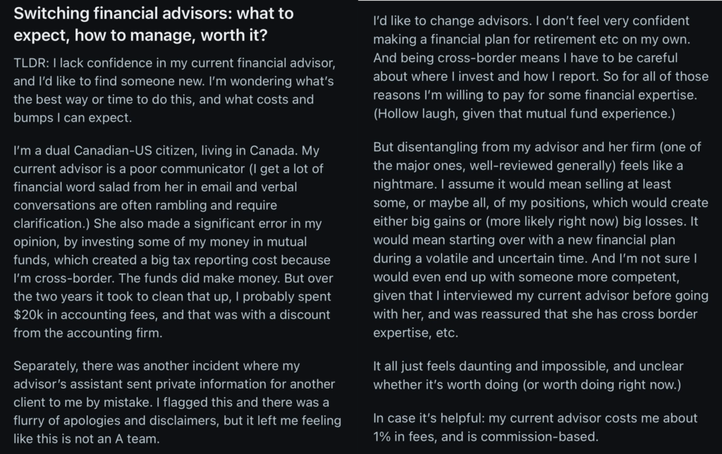 - Avoiding an uncomfortable conversation: Many clients, like Warren, hesitate simply because they dread telling their current Advisor they’re leaving.