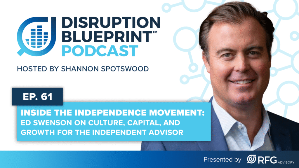 In this episode of the Disruption Blueprint Podcast, host Shannon Spotswood sits down with RFG Advisory’s newly named President, Ed Swenson, to reveal how RFG is redefining Advisor independence. With 25+ years of experience, including leadership roles at Dynasty Financial Partners and Osaic, Ed shares actionable insights on scaling your business, leveraging M&A and succession opportunities, and positioning your firm for long-term success in what he calls the “bull market for advice.”